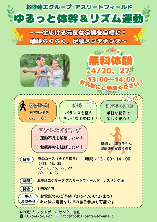 ご予約・お問い合わせ:お電話でのご予約(076-476-0427、北陸建工グループ アスリートフィールドまで)または、お電話なしでの当日参加も可能です